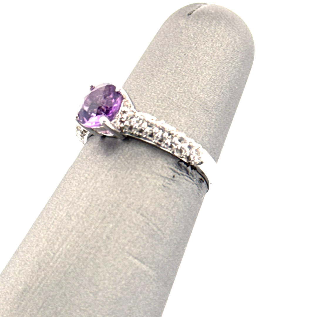 This striking ring showcases an enchanting aesthetic allure, created with a dominant amethyst centerpiece that effortlessly marries opulence with simplicity. Garnished with white topaz accents on each side, totaling 0.42 carats, it emits a captivating sparkle that is sure to enhance the beauty of any ensemble.