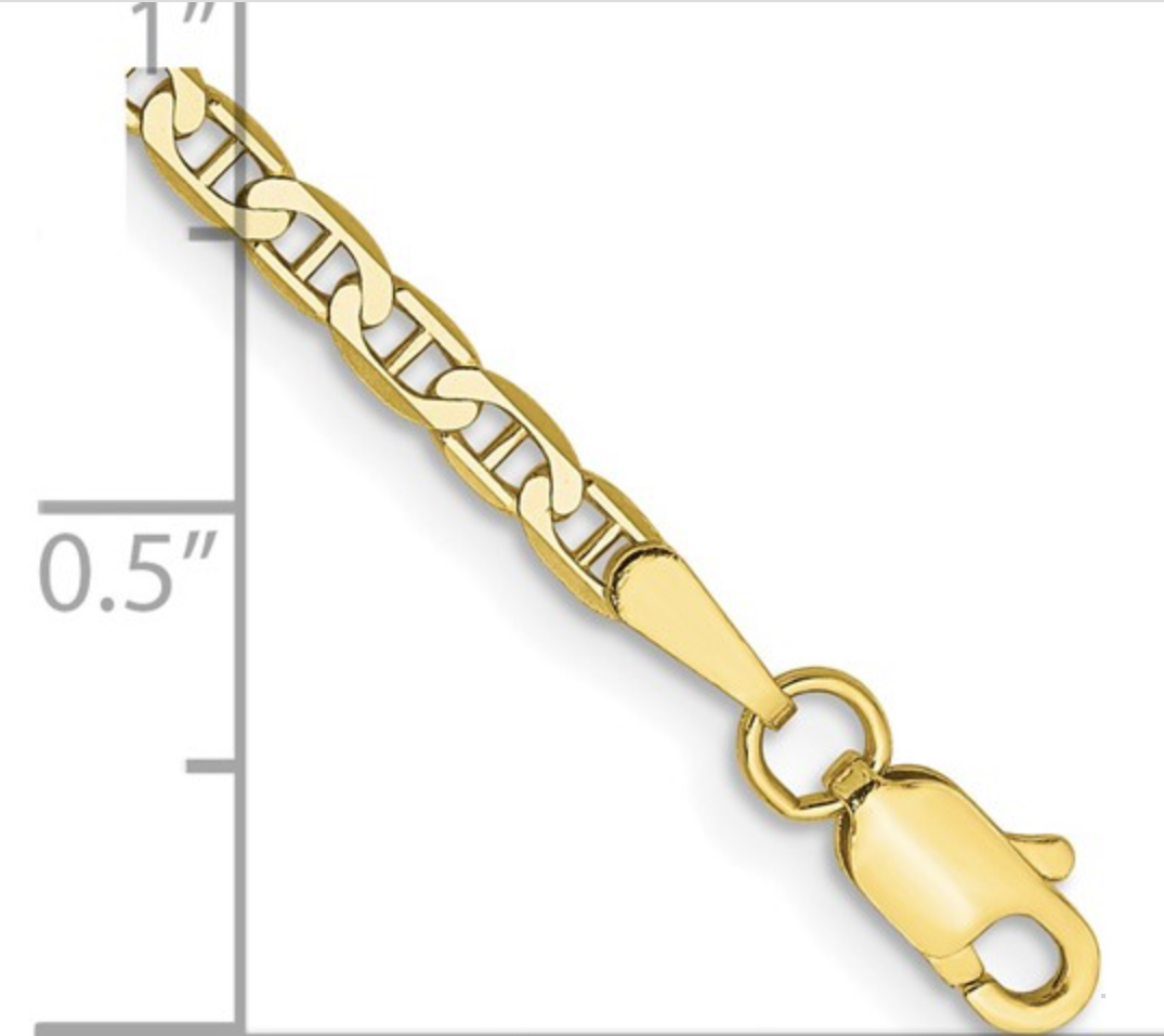 We’re thrilled to introduce an exquisite piece from our Gold Jewelry collection – a refined 10kt Yellow Gold Anklet, masterfully designed with a unique Flat Anchor Link and weighing approximately 2.39 grams. This anklet fuses timeless appeal with graceful elegance, creating a luxurious accessory that amplifies your charm with every step.