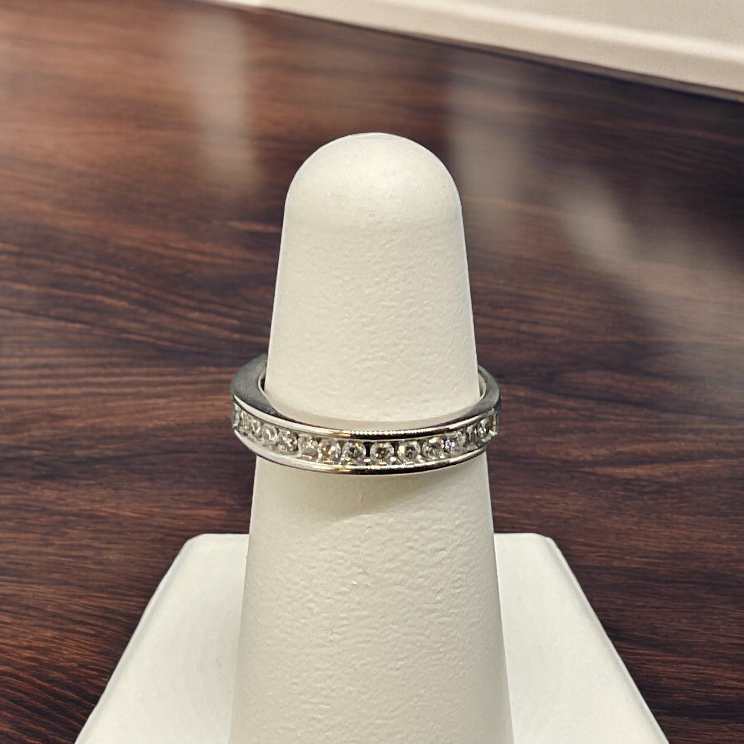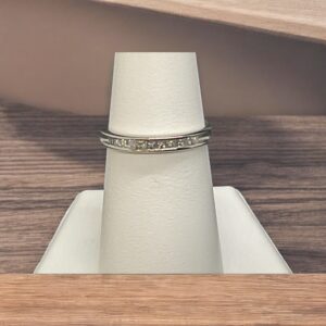 14K White Gold Channel Set Diamond Wedding Band featuring 28 round brilliant diamonds set in a channel setting. The total diamond weight is approximately 0.58 carats. The band width is 3.3 mm, making it a beautiful choice for celebrating love and commitment.
