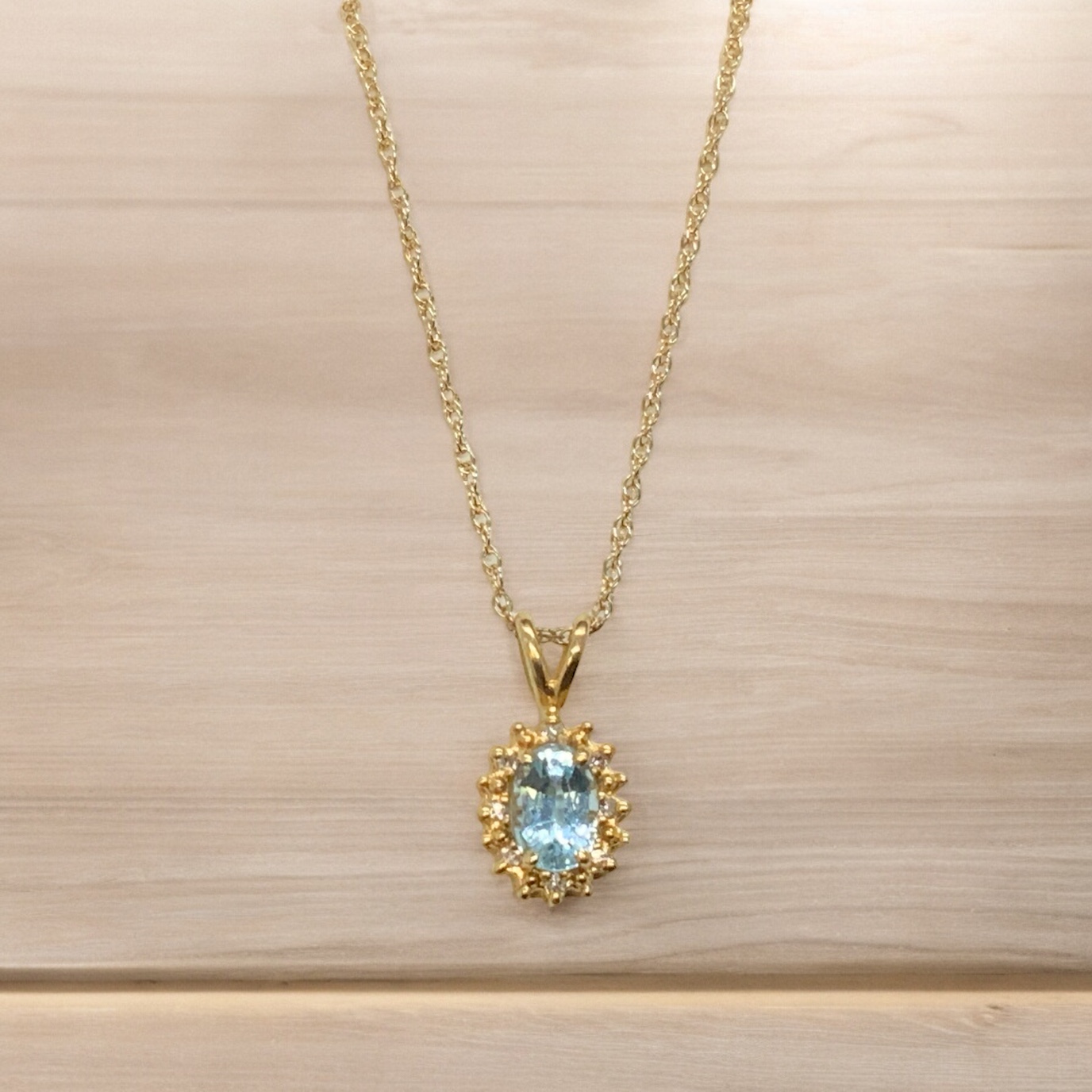 It is necessary to mention that this pendant, beyond its aesthetic charm, is also designed to stand the test of time. It is constructed with high-grade 14kt yellow gold, aquamarine and diamonds – unquestionably meeting both beauty and quality expectations. Adorn your neck with this exquisite necklace and enjoy its enduring charm and brilliance.