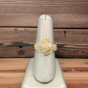 Painstakingly crafted with premier 14kt yellow gold, weighing a substantial 6.34 grams, this ring features a channel set of Baguettes and a stunning one-carat in diamonds, prong-set in an array of round cuts. This design surpasses ordinary fashion standards, standing as a radiant testament to your unique taste. This cocktail ring beautifully merges luxury and timeless elegance, distinguishing it with a charm all its own.