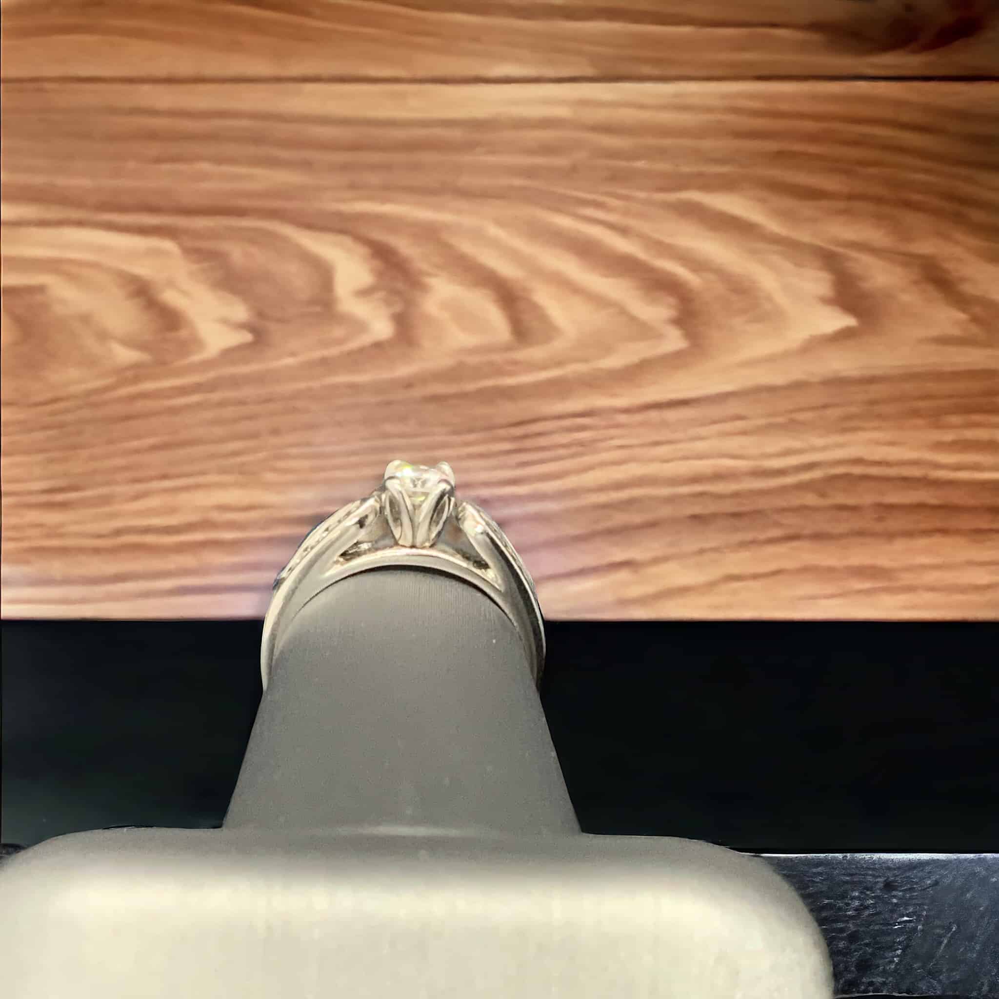 Skillfully made from premium 14kt white gold weighing 3.47 grams, this ring is further decorated with a mesmerizing 0.33 carat round diamond, complemented by eight additional round diamonds totaling 0.24 carat. This bridal ring effortlessly breaks away from the conventional, standing as an undeniable symbol of your unique taste and romance.