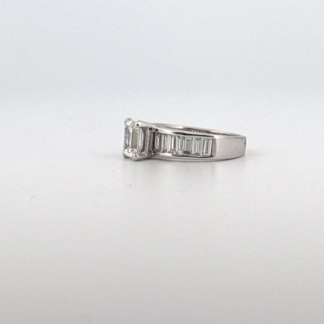 Introducing a brilliantly crafted bridal piece, shining with the timeless elegance of 14kt white gold weighing approximately 3.77 grams. Encrusted in the beauty of diamonds, this bridal piece boasts a majestic emerald cut diamond along with a charming baguette cut diamond. 2 carat total weight