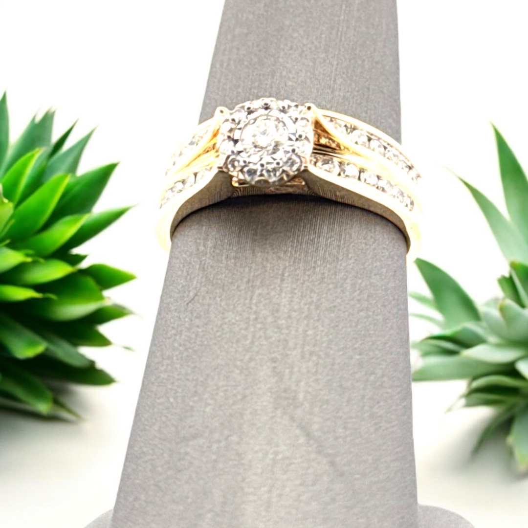 The breathtaking allure of this set lies in its expertly placed cluster diamonds. The center of attraction is a stunning 1 carat total weight in diamonds, complemented by the seamless elegance of channel-set diamonds along the band. The rich tones of yellow gold harmonize flawlessly with the sheer brilliance of the diamonds, radiating an aura of timeless splendor and glamour, making this bridal set a unique masterpiece and symbolizing the eternal bond of your relationship.