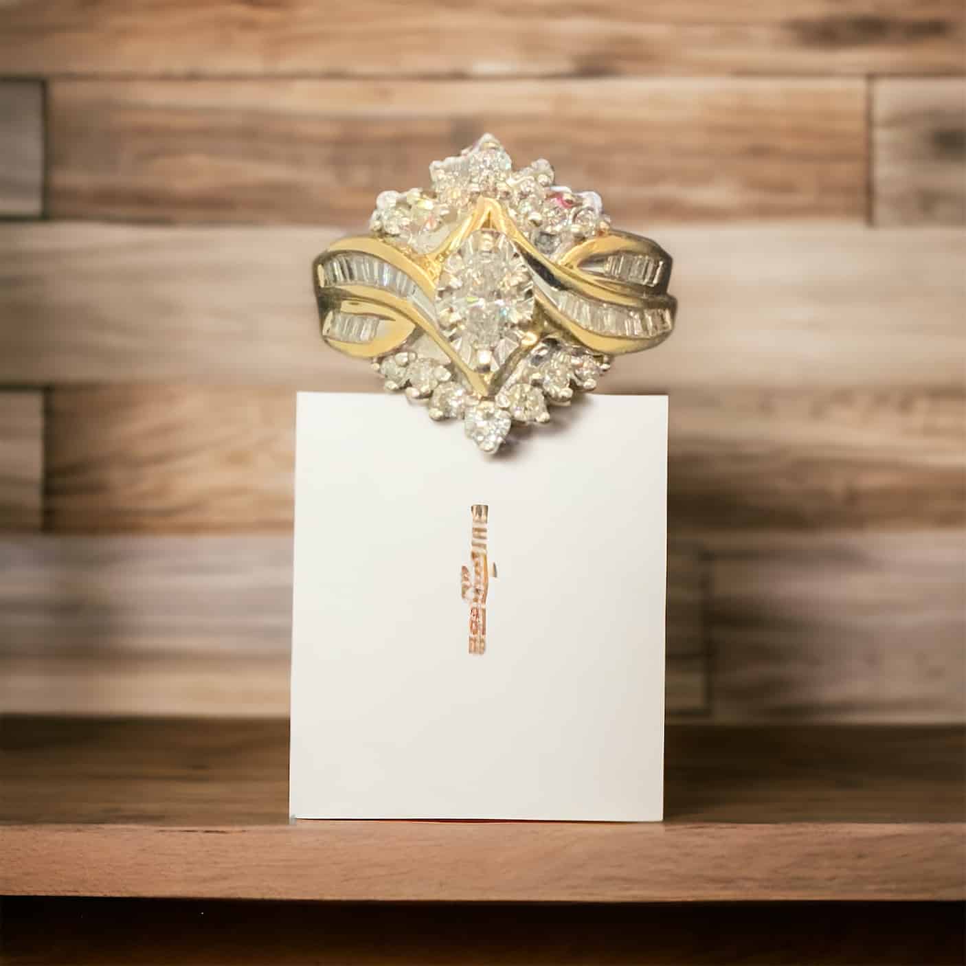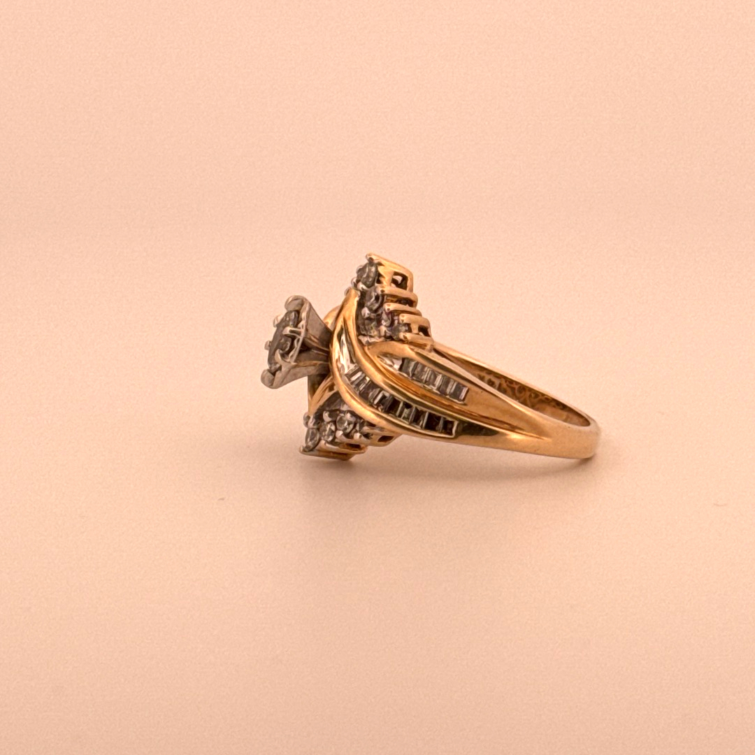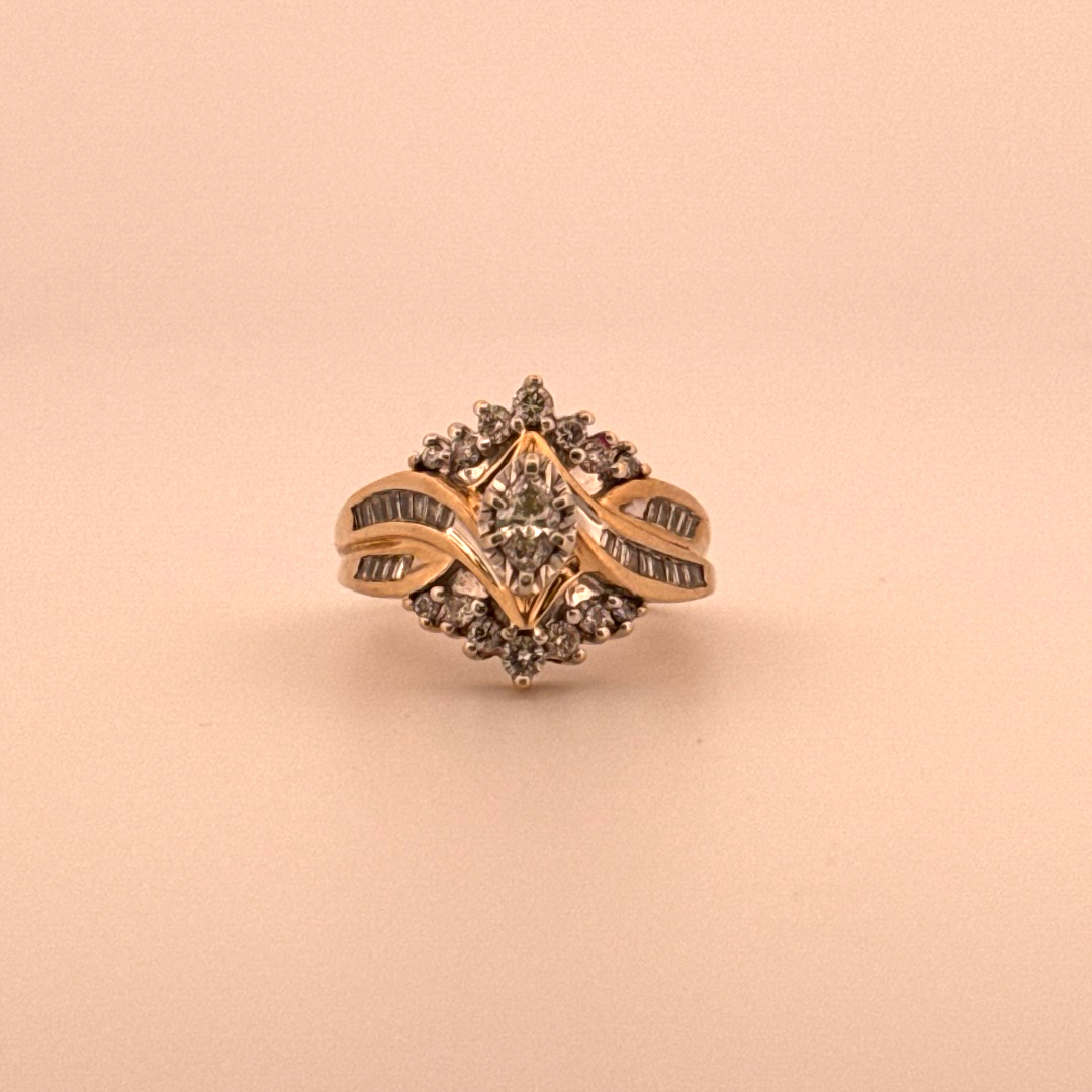Introducing an exquisitely crafted bridal piece, graced with a dazzling Marquise cut diamond. Situated amidst the glow of a 14kt yellow gold structure, this design exemplifies an enticing interplay between elegant charm and superior craftsmanship.