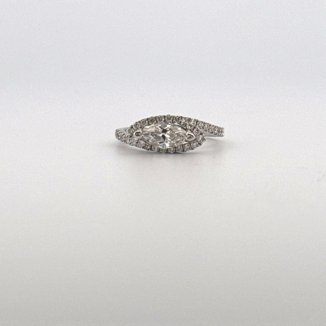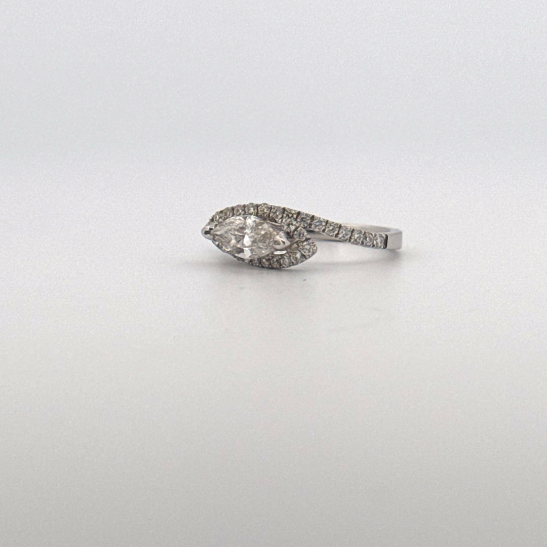Introducing a magnificent bridal diamond fashion piece, skillfully designed with a 0.82 carat Marquise diamond at its center, and complemented by multiple 0.39 carat round diamonds. This captivating arrangement is flawlessly set in an 18kt white gold weighing 3 grams, beautifully demonstrating an exquisite fusion of pristine charm and master craftsmanship.