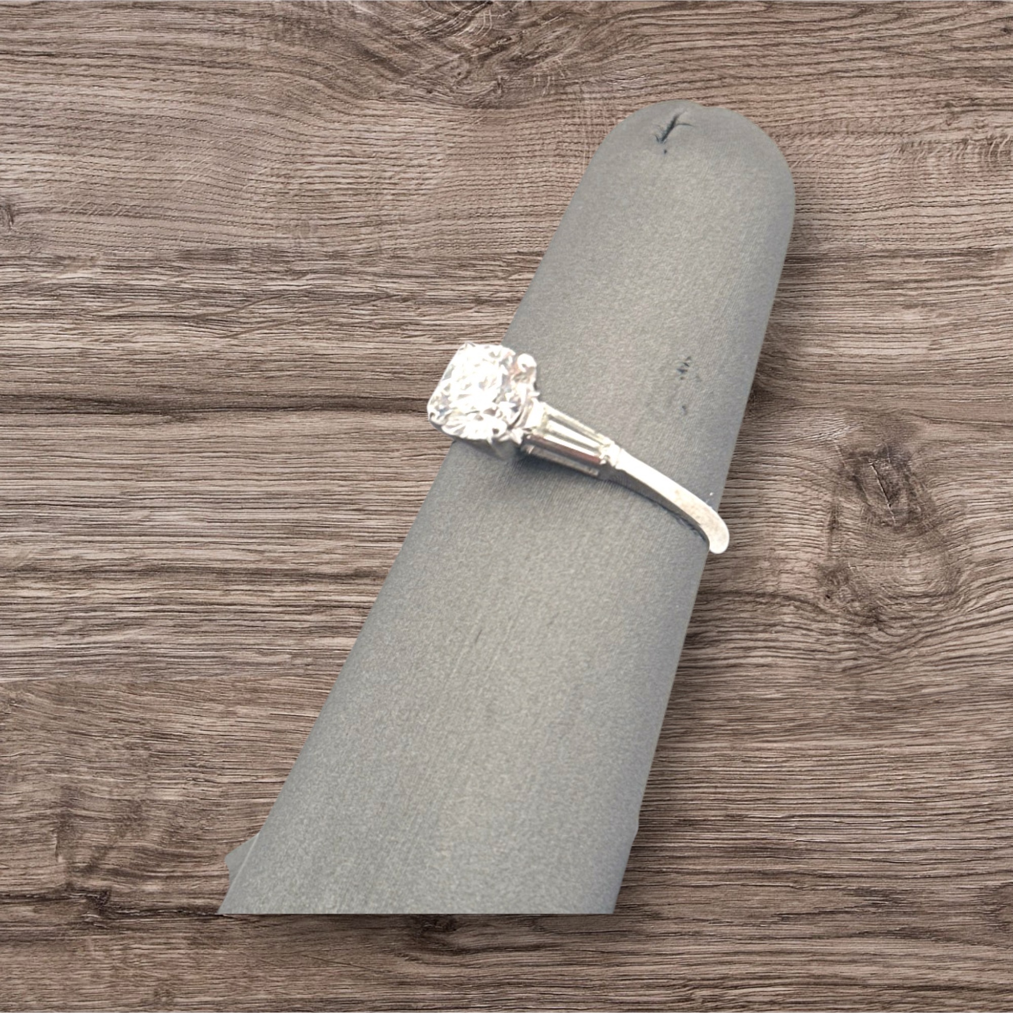 Platinum Semi Mount Approximately 1/4 Total Diamond Baguettes. Will accommodate 6 MM Round Center Stone