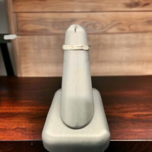Introducing an elegantly crafted wedding band, meticulously fashioned from an exquisite 14kt white gold, weighing 2.69 grams. The solemn purity of the white gold setting aptly symbolizes the unwavering affection and commitment in a marriage. Romantic and captivating, it’s the perfect piece to mark a significant moment in your life.