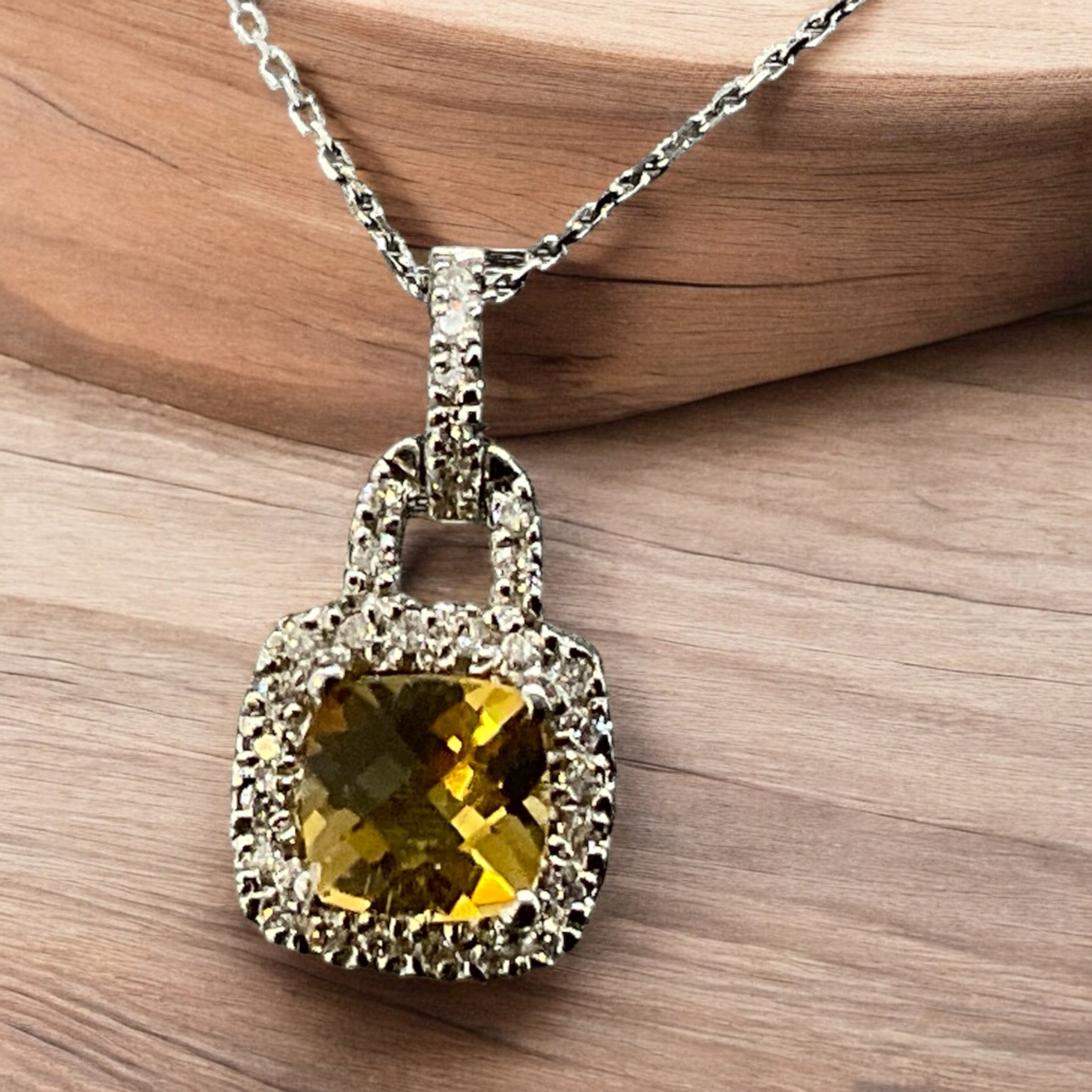 This exquisite pendant features a 14K white gold setting that perfectly highlights the stunning cushion-cut citrine at its center. The citrine, weighing 1.00 carat, displays a captivating golden-yellow color, radiating warmth and brilliance. Encircling the citrine is a delicate halo of round brilliant diamonds, with a total diamond weight of 0.15 carats. These diamonds add a touch of sparkle and elegance, enhancing the overall beauty of the pendant and making it a truly eye-catching piece.