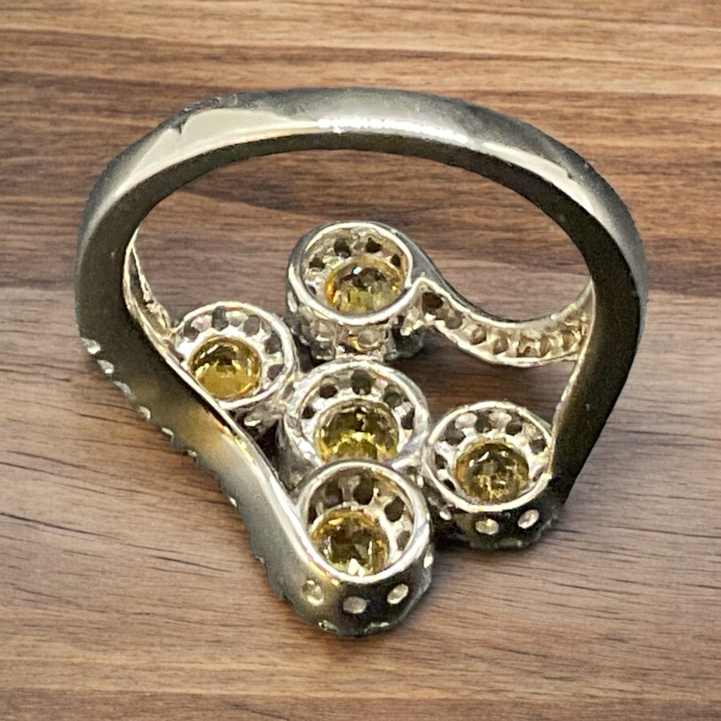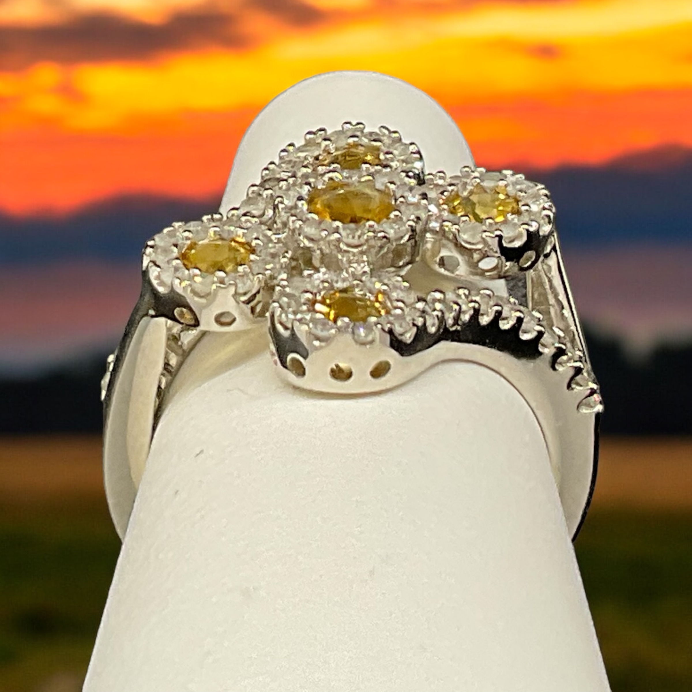 This 10K white gold ring features five round citrine gemstones, totaling 0.55 carats. Surrounding each citrine is a diamond halo, with a combined diamond weight of 0.57 carats in round brilliant diamonds. The design is both elegant and vibrant, making it a stunning piece for any occasion. 😊🌟