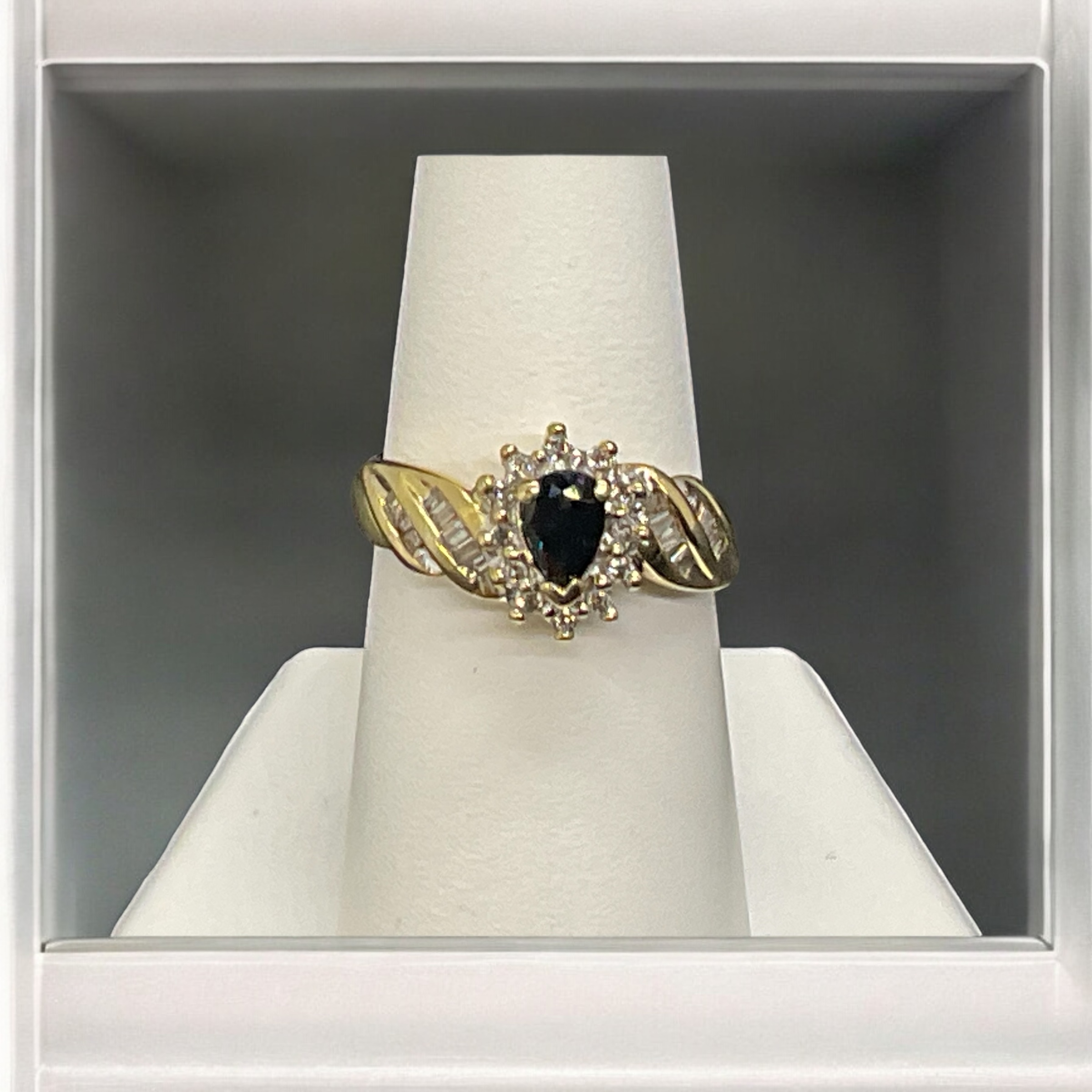 This exquisite 10K yellow gold ring features a .60-carat pear-shaped sapphire as its centerpiece. The sapphire is surrounded by a dazzling halo of round brilliant diamonds. Additionally, the band is adorned with baguette-cut diamonds. The total diamond weight in this stunning piece is .25 carats. The combination of the rich yellow gold, vibrant sapphire, and sparkling diamonds creates a truly elegant and eye-catching design. 🌟