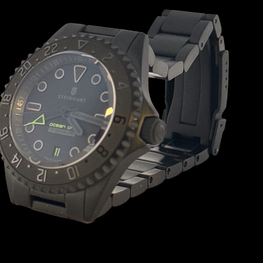 The STEINHART Ocean One Titanium GMT Phantom diver’s watch – a rare limited edition that combines the spirit of adventure and elegance. With its titanium case and strap in a completely black DLC look, a breathtaking 3D ceramic bezel and a transparent case back, it attracts all eyes. Powered by a precise ETA 2893-2 Premium movement, your watch will reliably accompany you on all your social and sporting ventures. The STEINHART Ocean One Titanium GMT Phantom is water-resistant to 50 ATM – ready to explore the underwater world? Hurry up, because only 100 pieces per color were made… limited edition. Become part of an exclusive community that appreciates style and quality. Get hold of your unique STEINHART Ocean One Titanium GMT Phantom and start your next adventure!