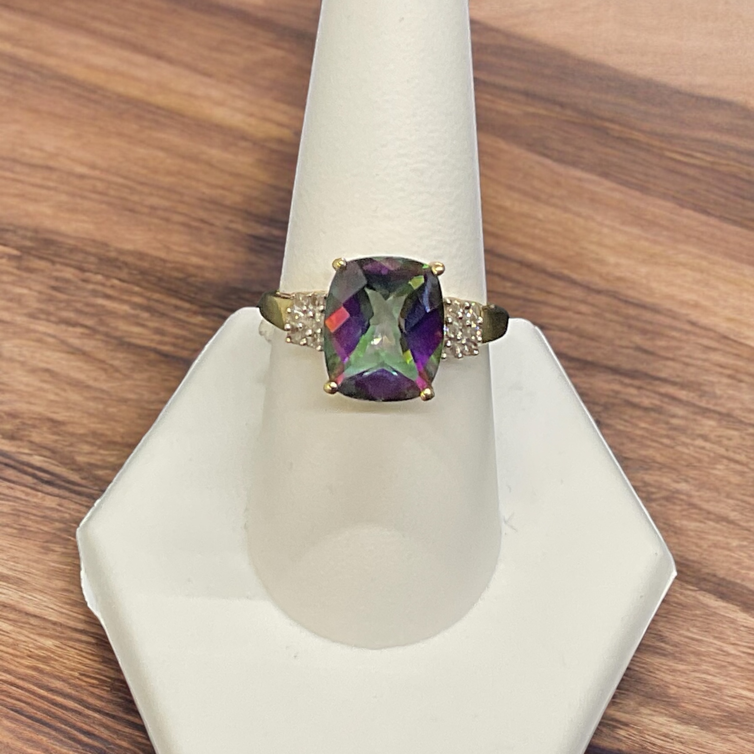 .10 Carat Total Weight in Diamonds: Surrounding the mystic topaz are diamonds with a total weight of .10 carats. These diamonds add a touch of sparkle and elegance, enhancing the overall brilliance of the piece.
