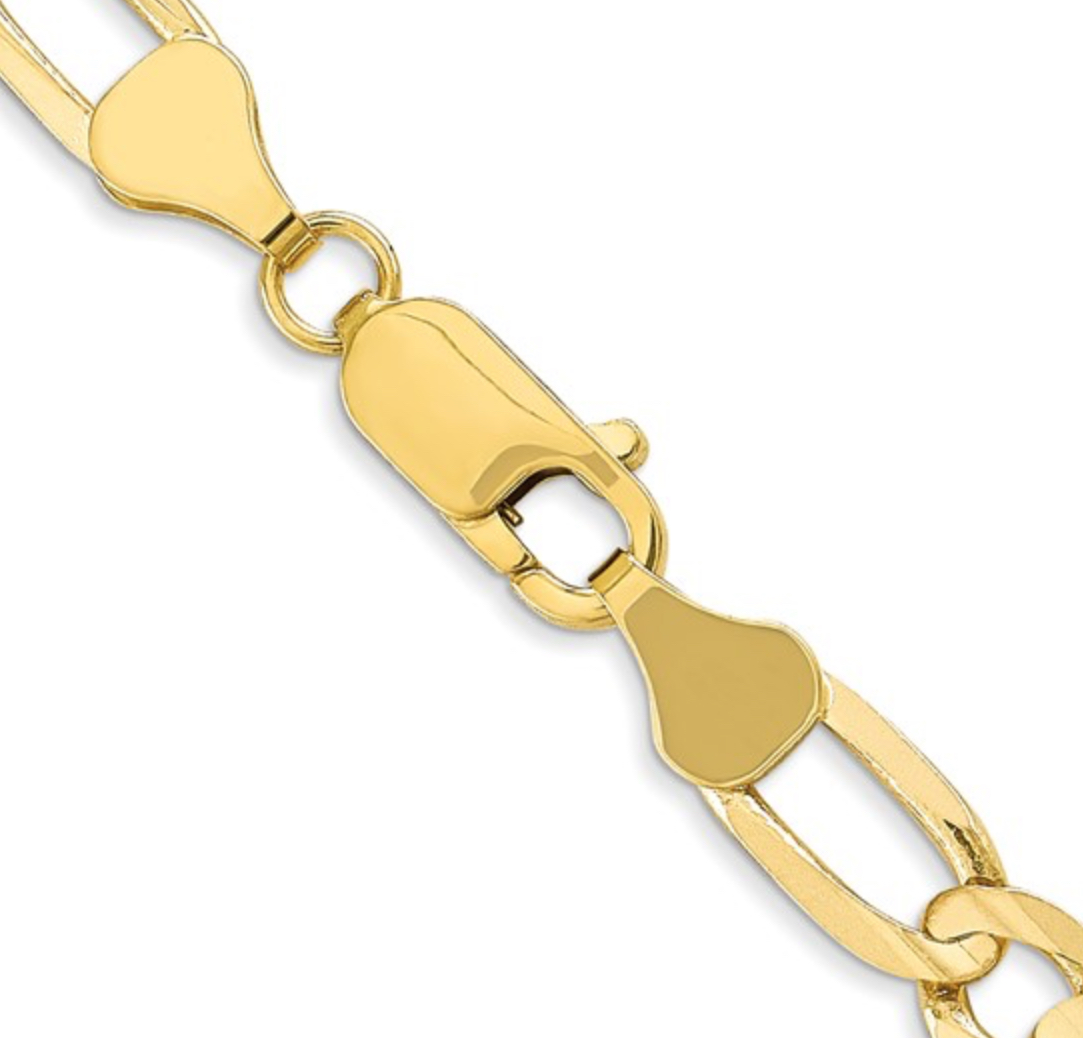Forged from the finest 10kt yellow gold with an impressive weight of 21.53 grams, this necklace showcases a classic Figaro chain design, noteworthy with its distinct pattern of three small circular links interjected by a longer oval link. The 24-inch length necklace with a width of 6mm stands out in a world of standard creations, serving as a beacon of your unmatched taste. The blend of semi-lustrous gold emanates eternal elegance and luxury, crafting a charm that is undeniably its own.
