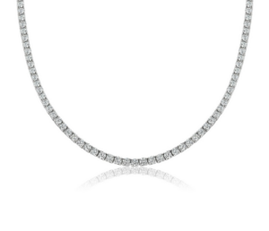 Expertly sculpted from the finest 14kt white gold, this regal necklace parades a standard tennis style design adorned with glinting diamonds that add an irresistible charm, outshining ordinary creations and symbolizing your unrivaled taste. The harmonious amalgamation of lustrous white gold and sparkling diamonds exudes an aura of eternal elegance and luxury that is uniquely its own.